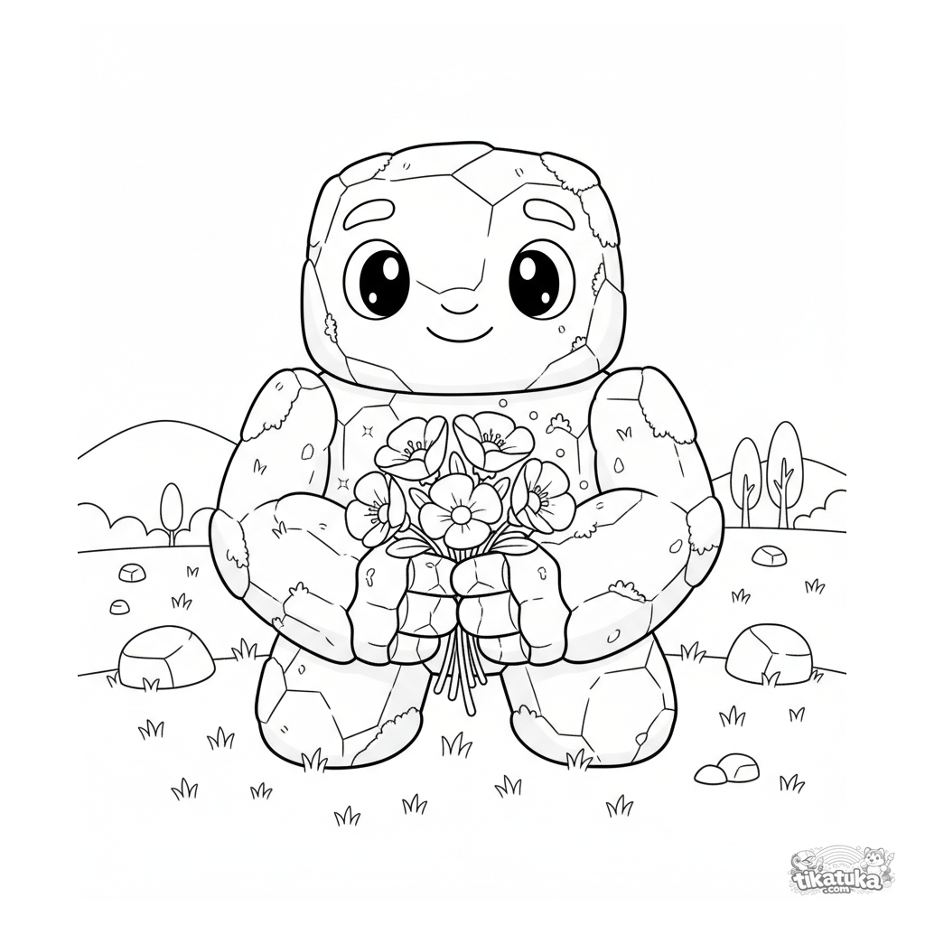 Página para colorir para 7-9 anos: um gentil golem de pedra ao anoitecer segura cuidadosamente um buquê de flores da lua brilhantes. Cena de fantasia comovente.
