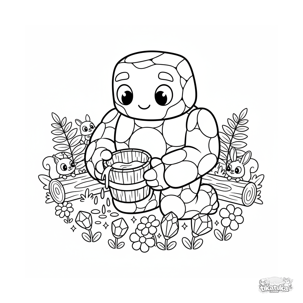 Página simples para colorir para crianças pequenas 2-3: um golem de pedra grande e gentil rega flores mágicas em uma floresta. Formas grandes, poucos detalhes.