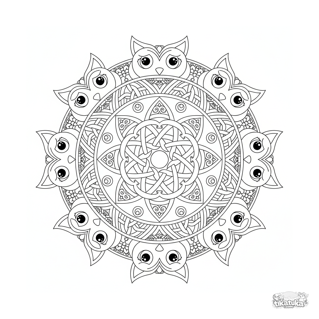 Mandala geométrica intrincada com nó celta para colorir. Padrões entrelaçados e símbolos, perfeito para crianças de 10 a 12 anos.