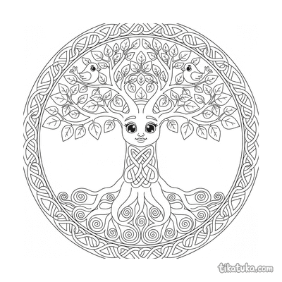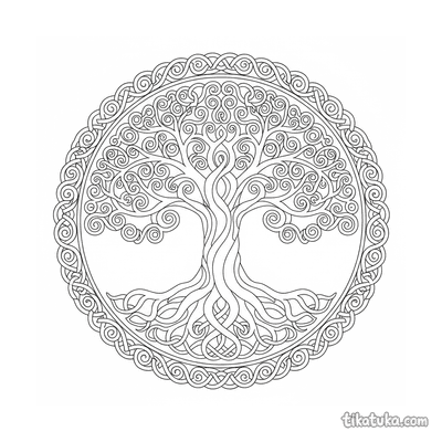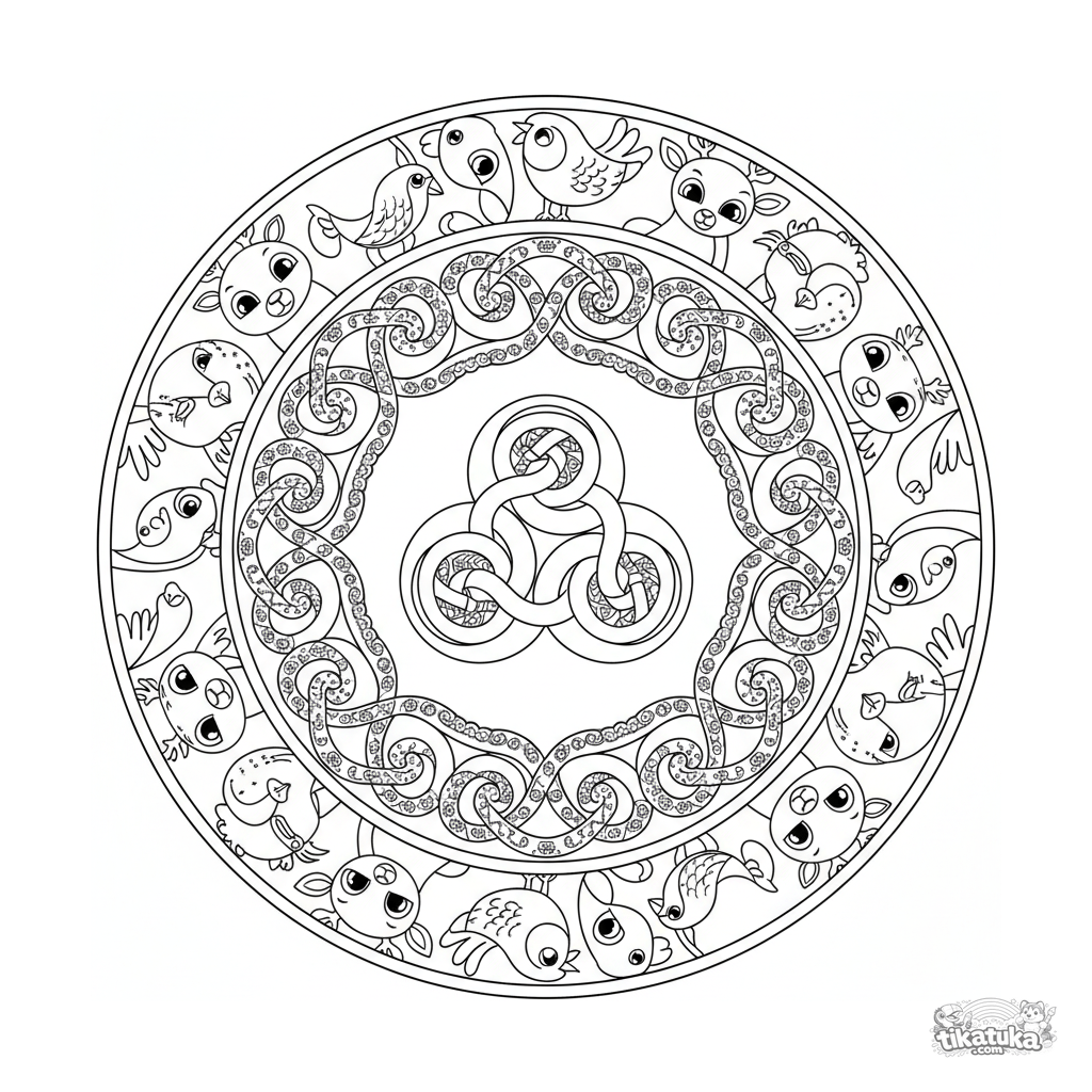Página para colorir mandala de nós celtas intrincada para 10-12 anos. Nó da trindade central, espirais entrelaçadas e borda decorativa.