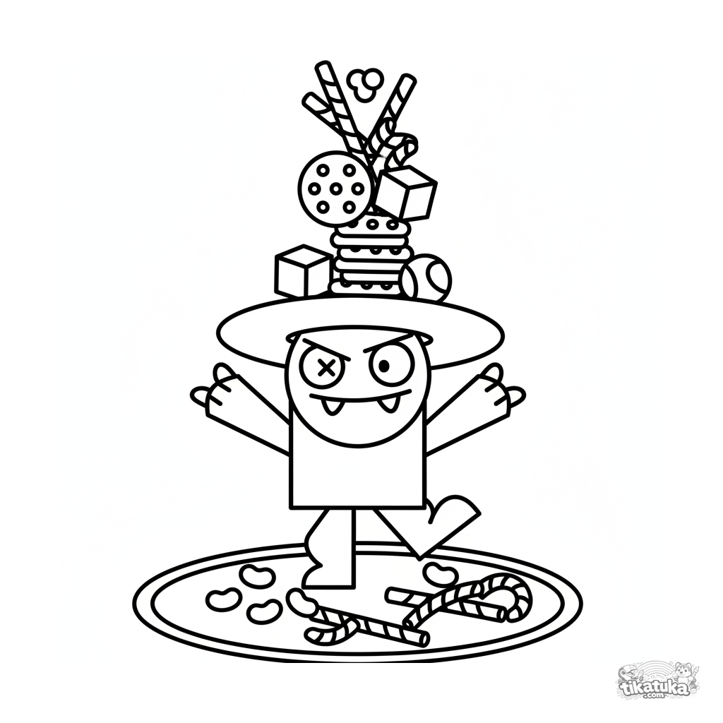 Página para colorir muito simples para os mais novos: um monstro geométrico equilibrando uma torre de guloseimas em um piquenique. Formas grandes e claras.