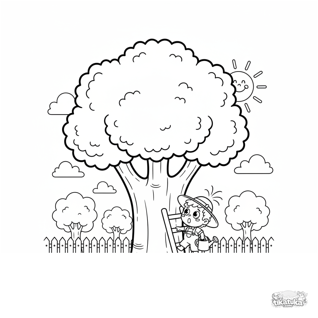 Página para colorir divertida para pré-adolescentes 7-9: um brócolis gigante e um jardineiro minúsculo com escada. Cena humorística.