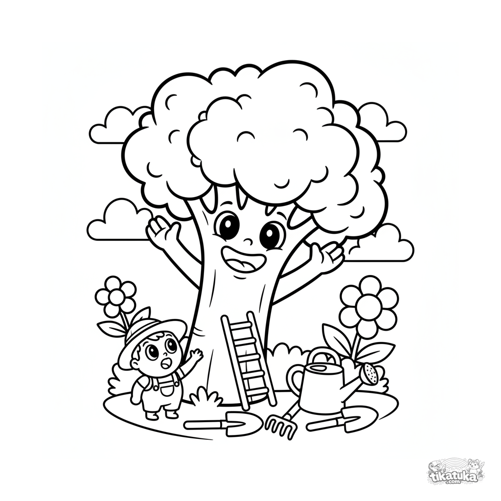 Página para colorir engraçada para pré-adolescentes 7-9: um enorme brócolis sorridente e um jardineiro minúsculo admirado. Cena humorística com escada e ferramentas, formas dinâmicas de desenho animado dos anos 90.