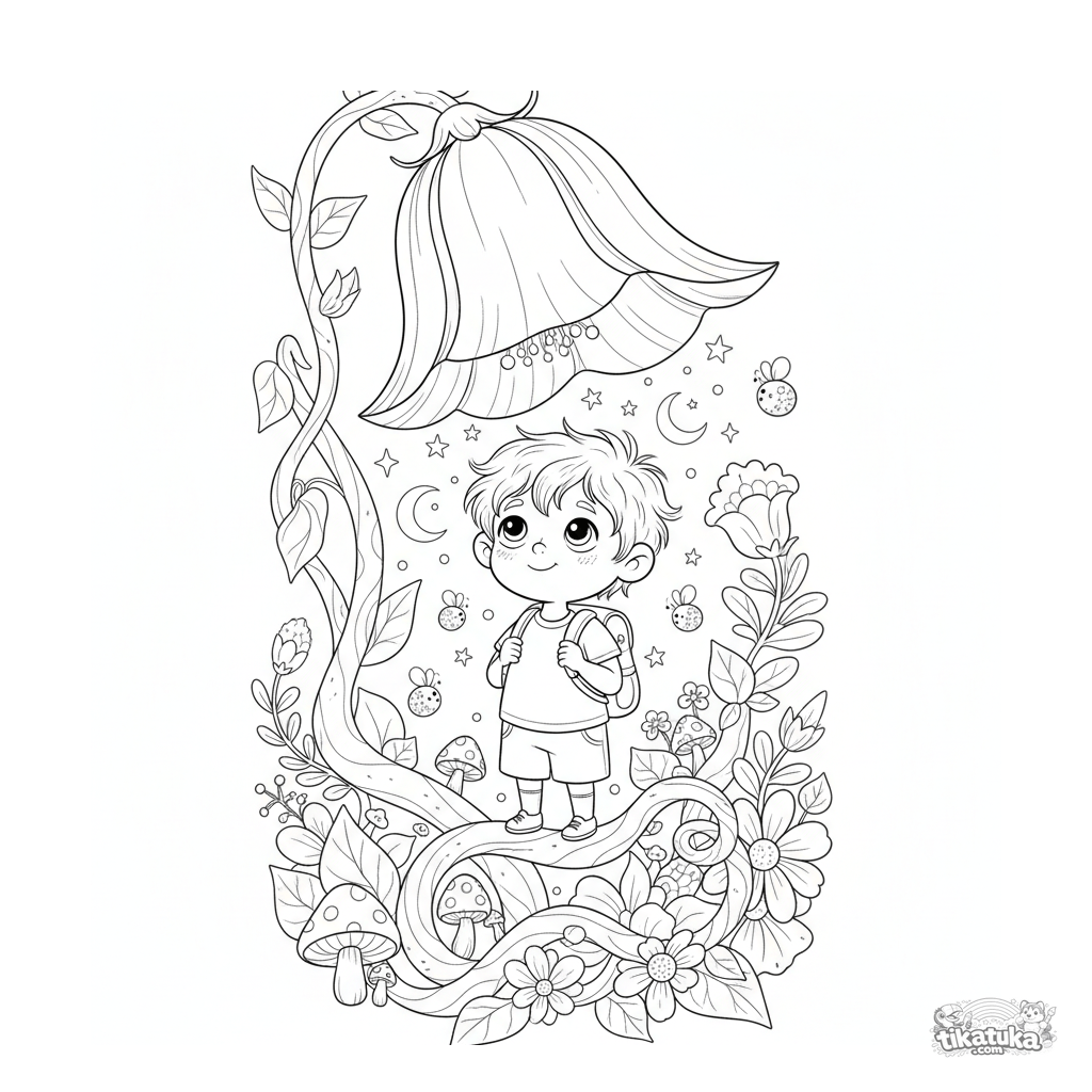 Página para colorir para crianças de 7 a 9 anos: uma criança dentro de uma flor da lua gigante mágica em um jardim noturno. Cena de fantasia.