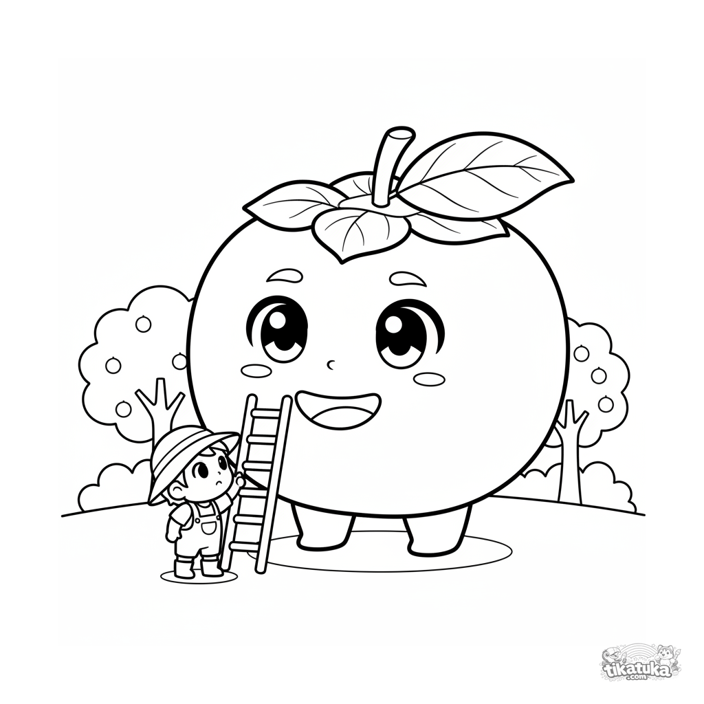 Página para colorir para crianças 4-6: um caqui gigante alegre e um jardineiro minúsculo com escada em um pomar. Estilo chibi.