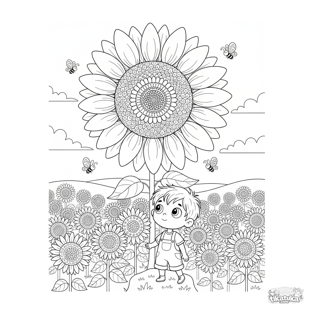 Página detalhada para colorir para crianças maiores de 10-12 anos. Um girassol gigante fantástico em um campo, com uma criança espiando. Cena em camadas, detalhes ricos.