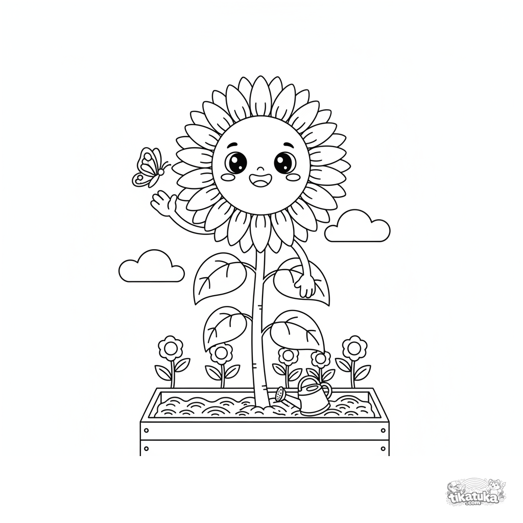 Página para colorir de um girassol gigante sorridente em um canteiro para crianças de 4-6 anos. Estilo kawaii fofo, formas simples, borboleta e regador.