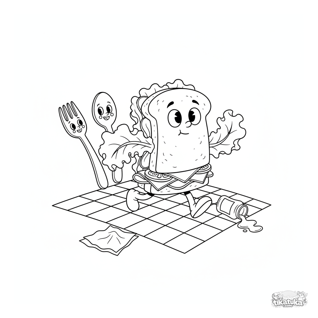 Página divertida para colorir de um sanduíche gigante correndo sendo perseguido por utensílios felizes. Para crianças de 4 a 6 anos.
