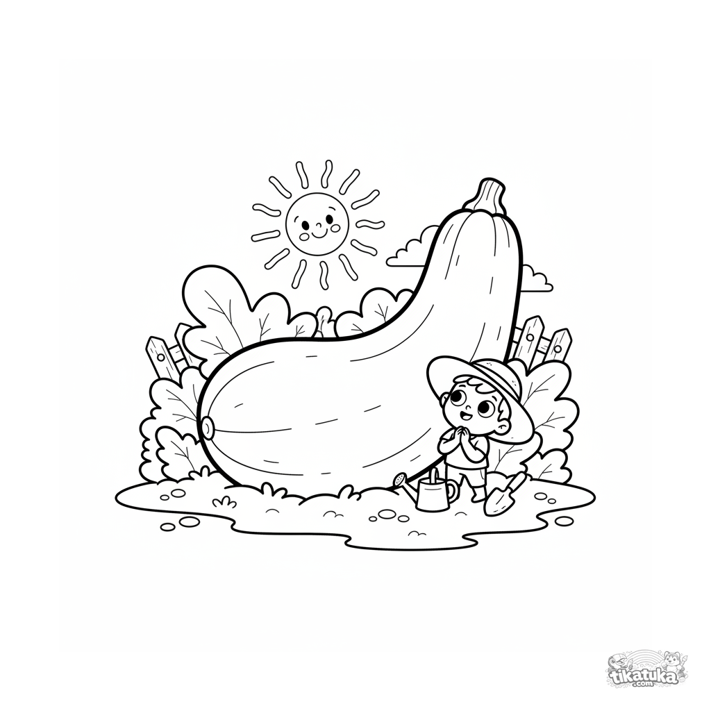 Página para colorir para 7-9 anos: uma abobrinha gigante no canteiro e um jardineiro minúsculo admirado. Cena engraçada com contraste de tamanhos.