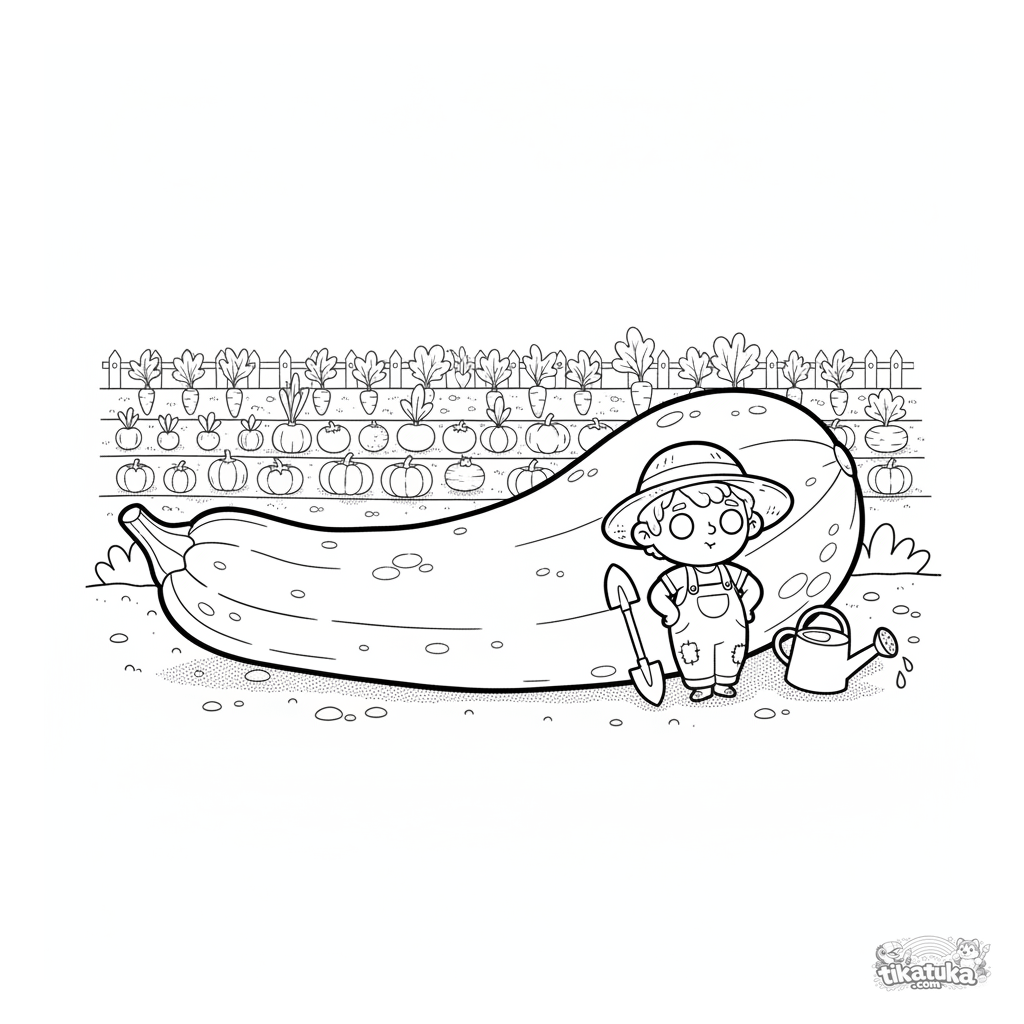 Página para colorir humorada para pré-adolescentes 7-9: uma abobrinha gigante e um jardineiro minúsculo cansado. Cena estilo livro de histórias.