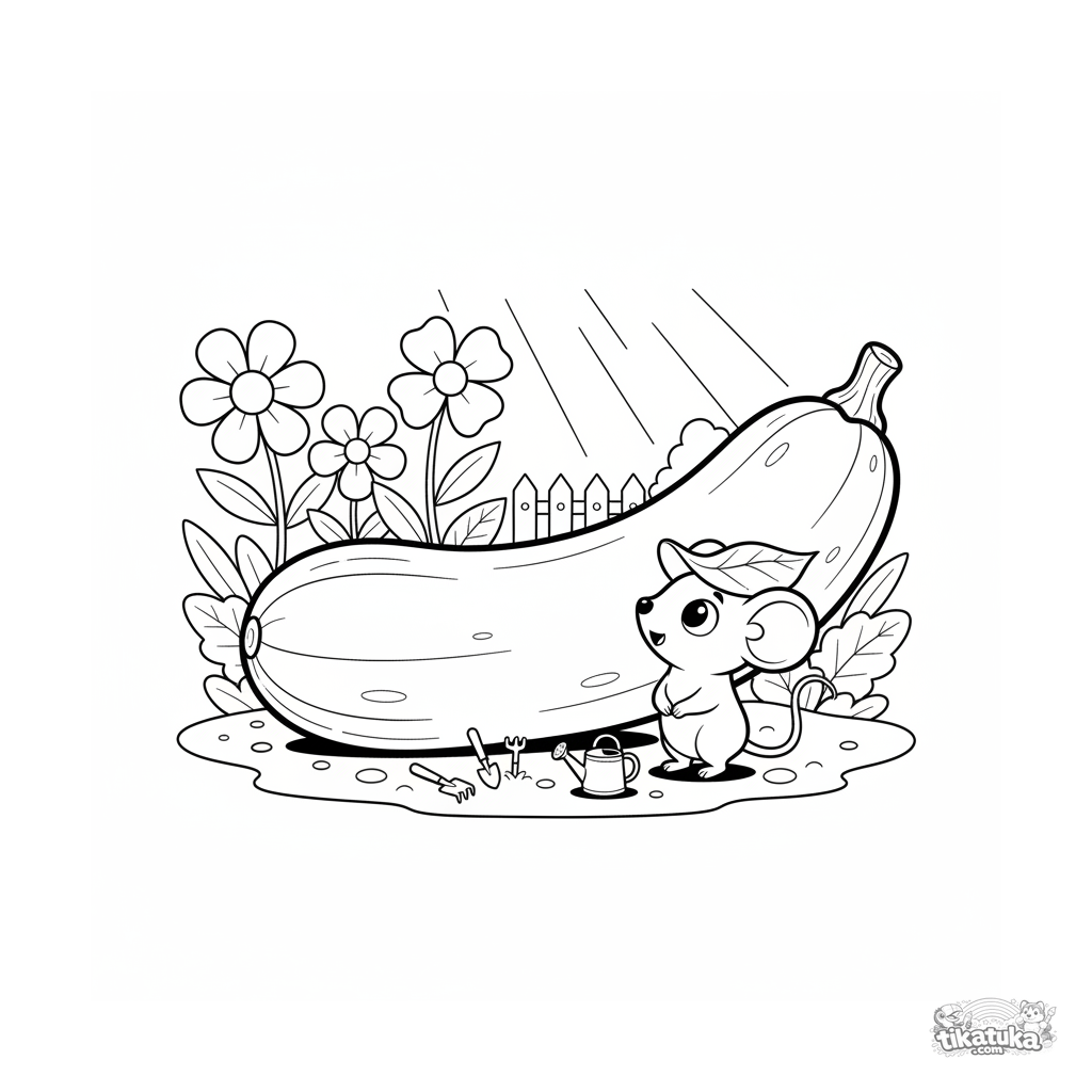 Página para colorir de uma abobrinha gigante e um rato jardineiro em um canteiro. Para crianças de 7-9 anos. Cena com legume gigante, rato pequeno e ferramentas.