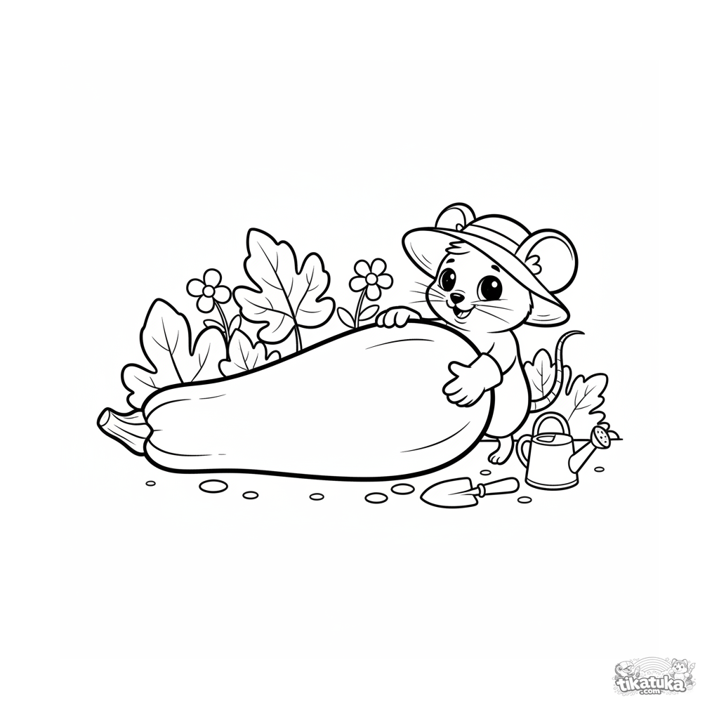 Página para colorir para crianças 4-6: uma abobrinha gigante e um ratinho jardineiro na horta. Contraste de tamanho engraçado, cena estilo livro.