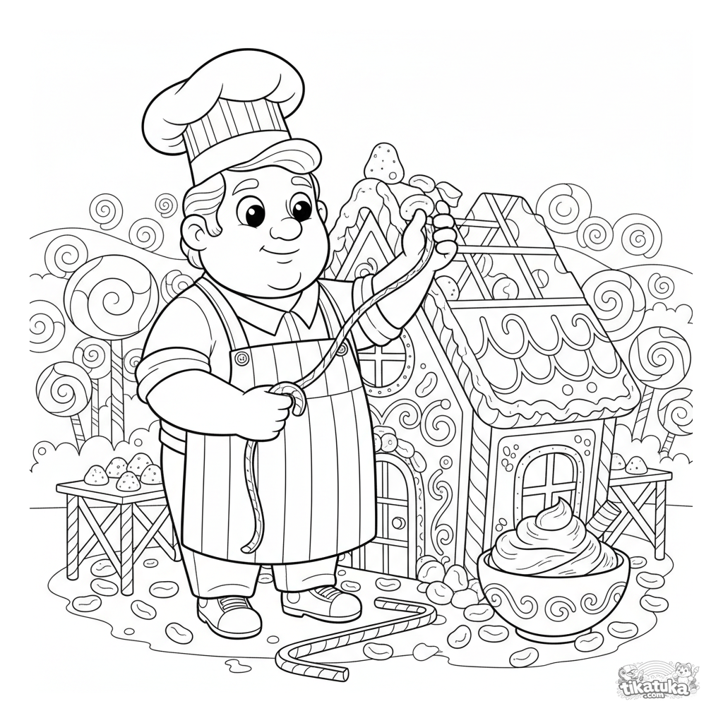 Página para colorir intrincada de conto de fadas: um construtor de doces constrói uma casa de gengibre. Para crianças de 8 a 12 anos. Detalhes incluem andaimes de bengala doce, uma tigela de glacê e tijolos de jujuba.