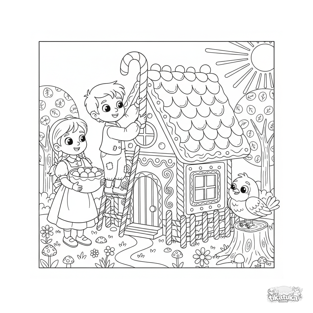 Página para colorir de conto de fadas de João e Maria construindo sua casa de gengibre de doces. Para crianças de 6 a 9 anos. Muitos elementos doces e detalhados para colorir.