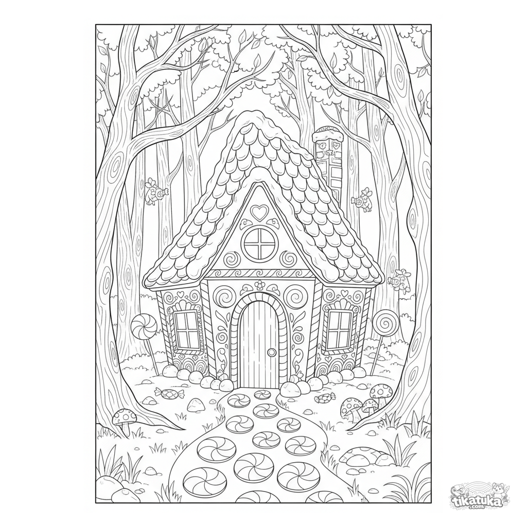 Página detalhada para colorir do conto 'João e Maria' para crianças de 7-12 anos. A casa de gengibre escondida na floresta, decorada com doces.