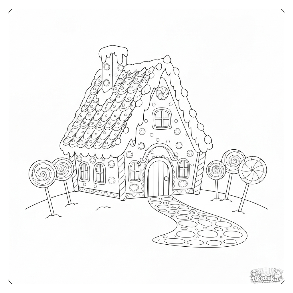 Página para colorir de conto: a casa de gengibre de João e Maria. Casa feita de biscoitos e doces com árvores de pirulito. Para crianças de 5 a 8 anos.