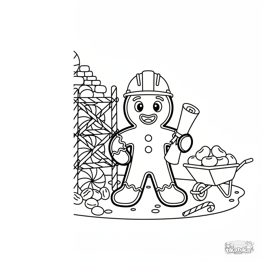 Página simples para colorir para crianças pequenas: um biscoito de gengibre alegre com chapéu de arquiteto em um canteiro de obras de doces.
