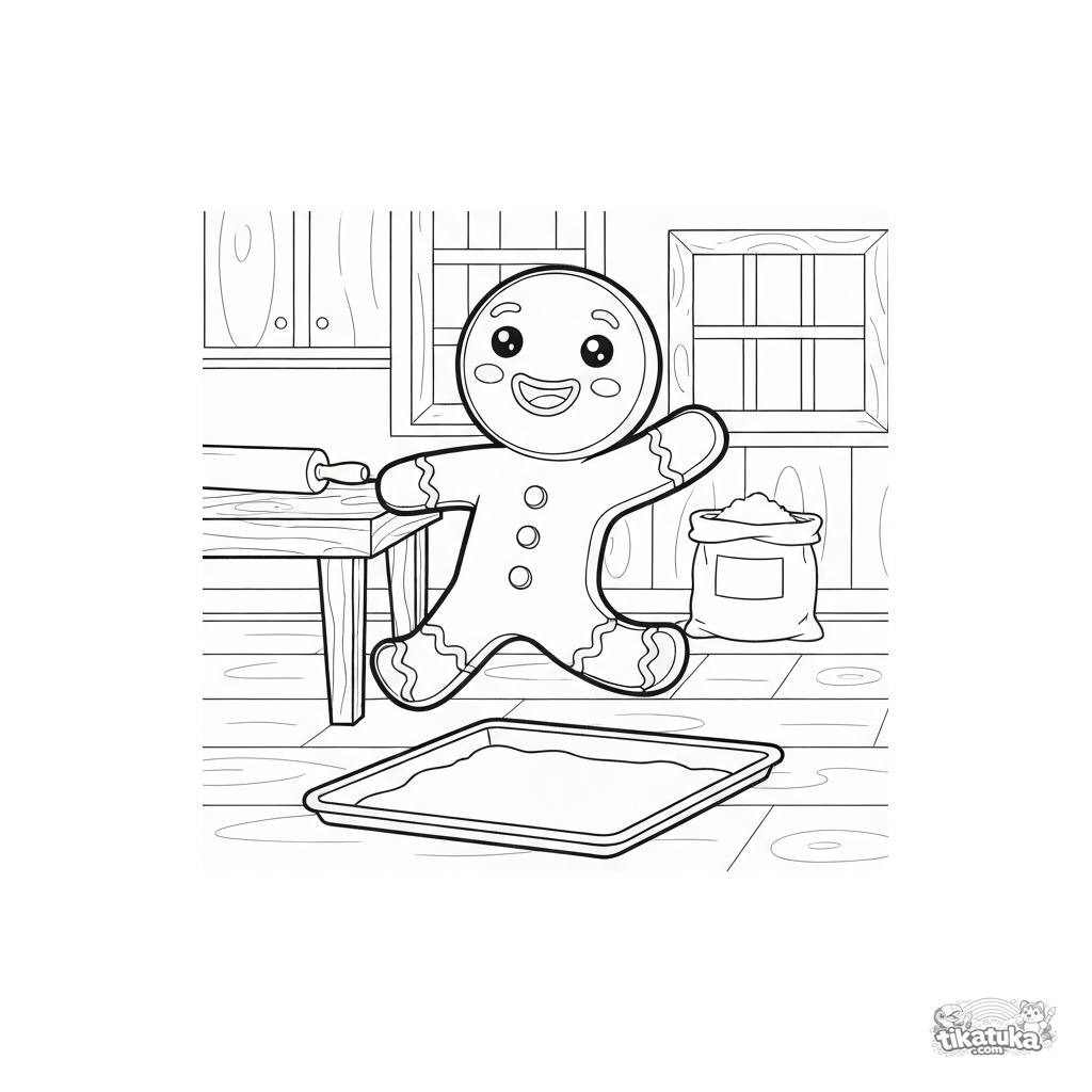 Página simples para colorir para crianças de 2 a 5 anos do conto de fadas. Um biscoito de gengibre salta da forma para fugir numa cozinha.