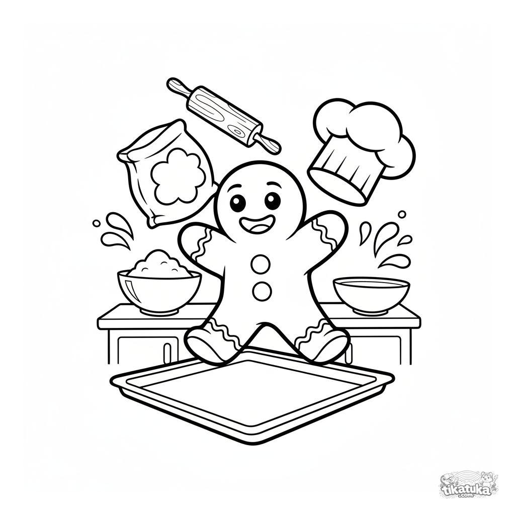 Página simples para colorir do conto do Biscoito de Gengibre, fugindo de uma forma de assar. Para crianças de 2 a 5 anos. Cena engraçada com farinha e rolo de massa.