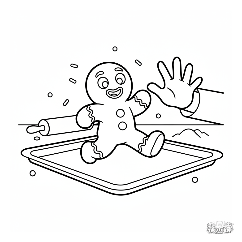 Página simples para colorir para crianças pequenas de 2-3 anos: um biscoito de gengibre atrevido foge por uma assadeira da mão de um chef. Formas muito grandes e simples, quase sem fundo.