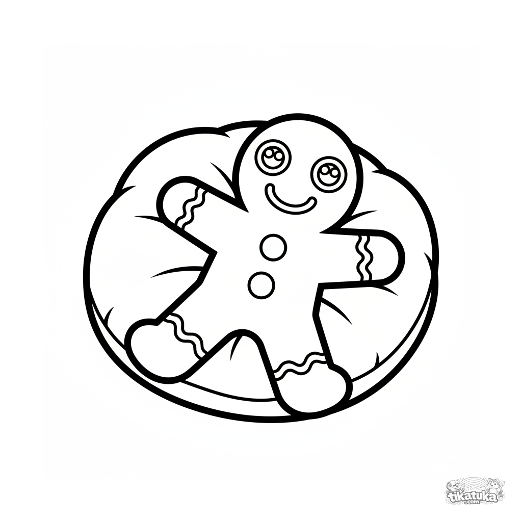 Página para colorir de feriado para bebês de 2-3 anos: um biscoito de gengibre deita-se em um travesseiro macio. Detalhes grandes, forma clara.
