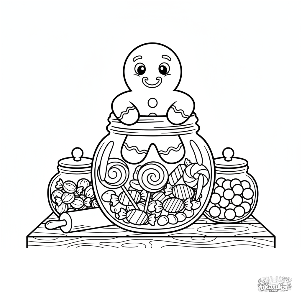 Página para colorir de um biscoito de gengibre espiando de um pote de biscoitos. Para crianças de 2 a 5 anos.