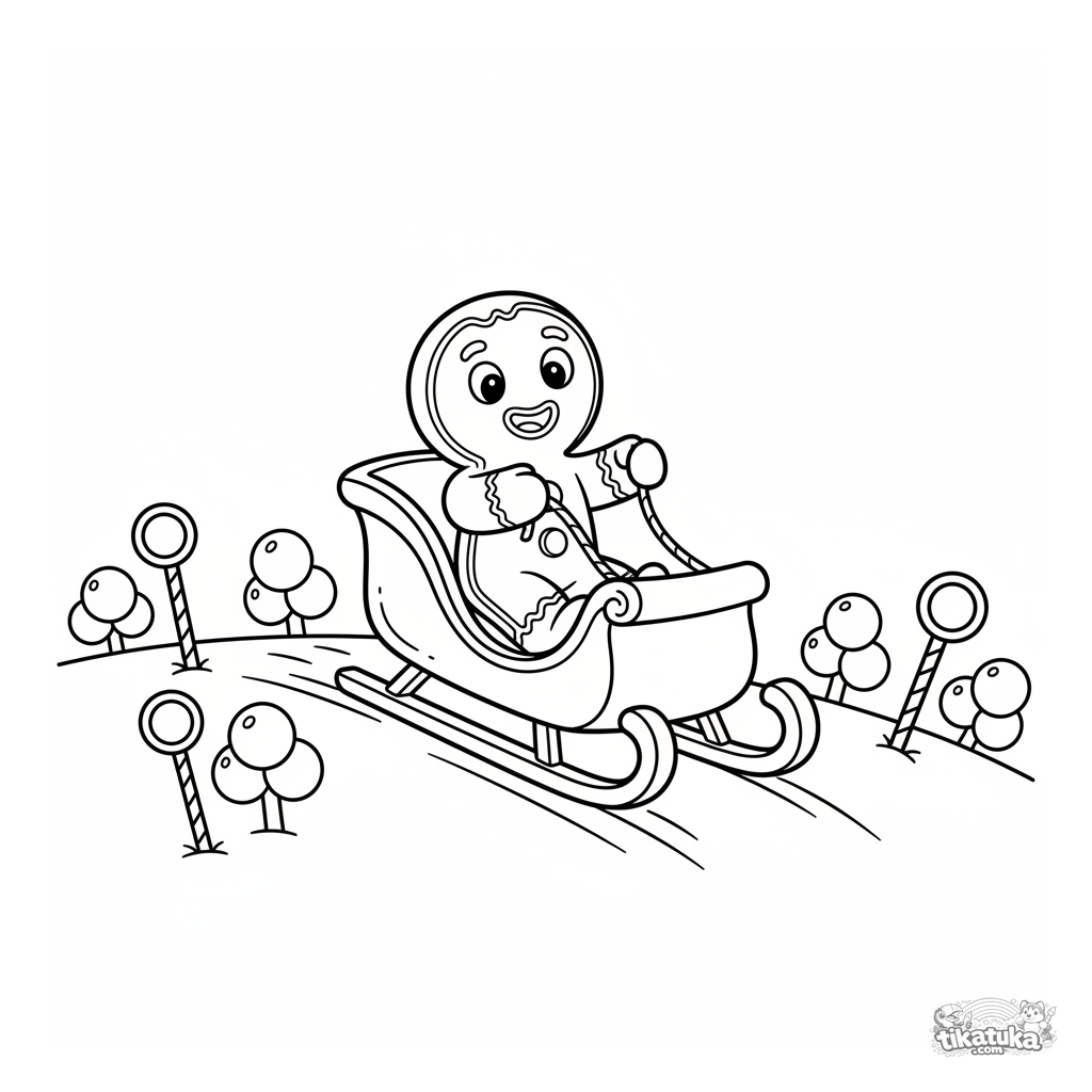 Página para colorir fácil para crianças de 2 a 5 anos: um biscoito de gengibre feliz monta um trenó de bala de cana numa colina de glacê.