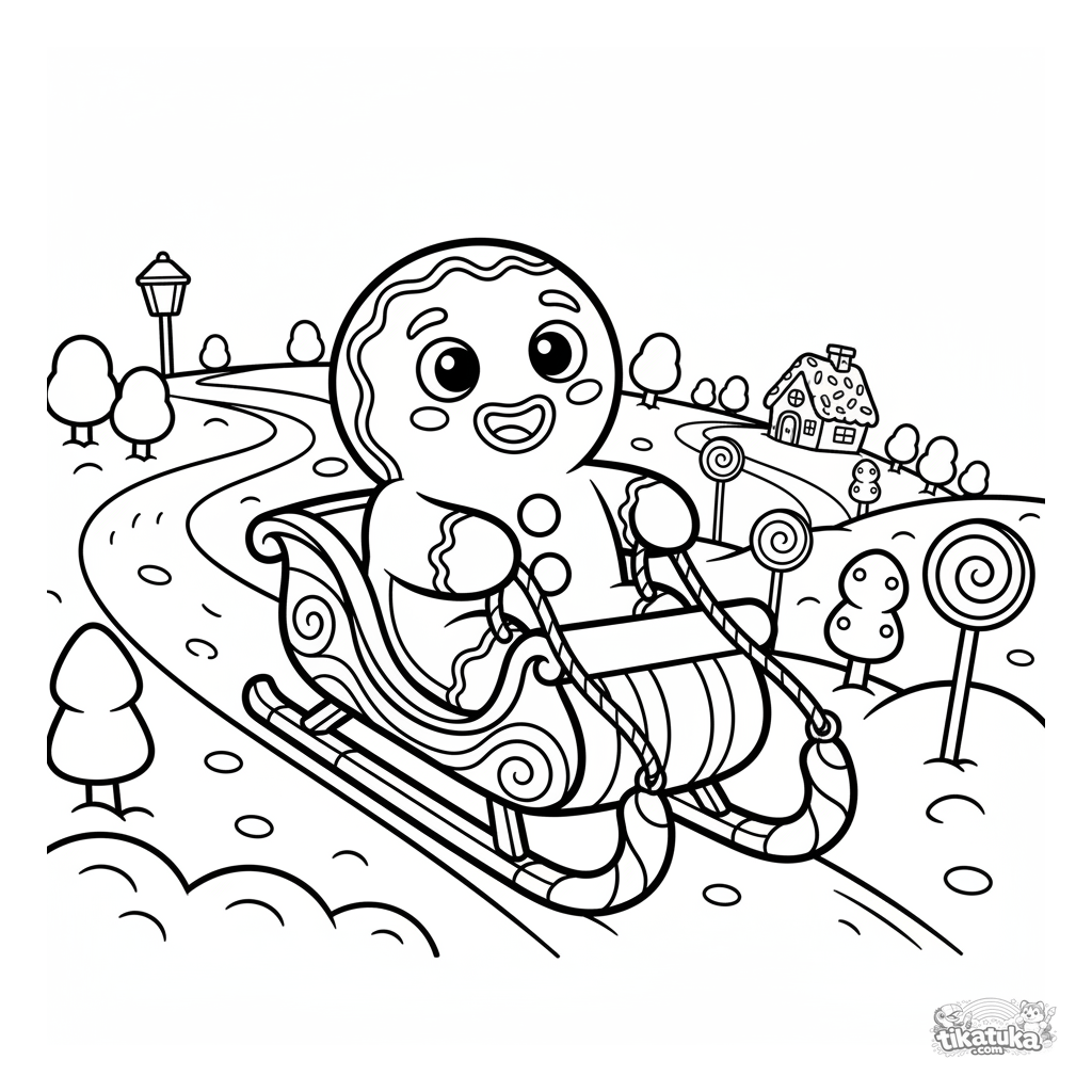 Página para colorir para crianças pequenas 2-5: um homem de gengibre alegre com olhos de glacê anda em um trenó de bengala doce descendo uma colina de glacê em uma terra de conto de fadas doce.