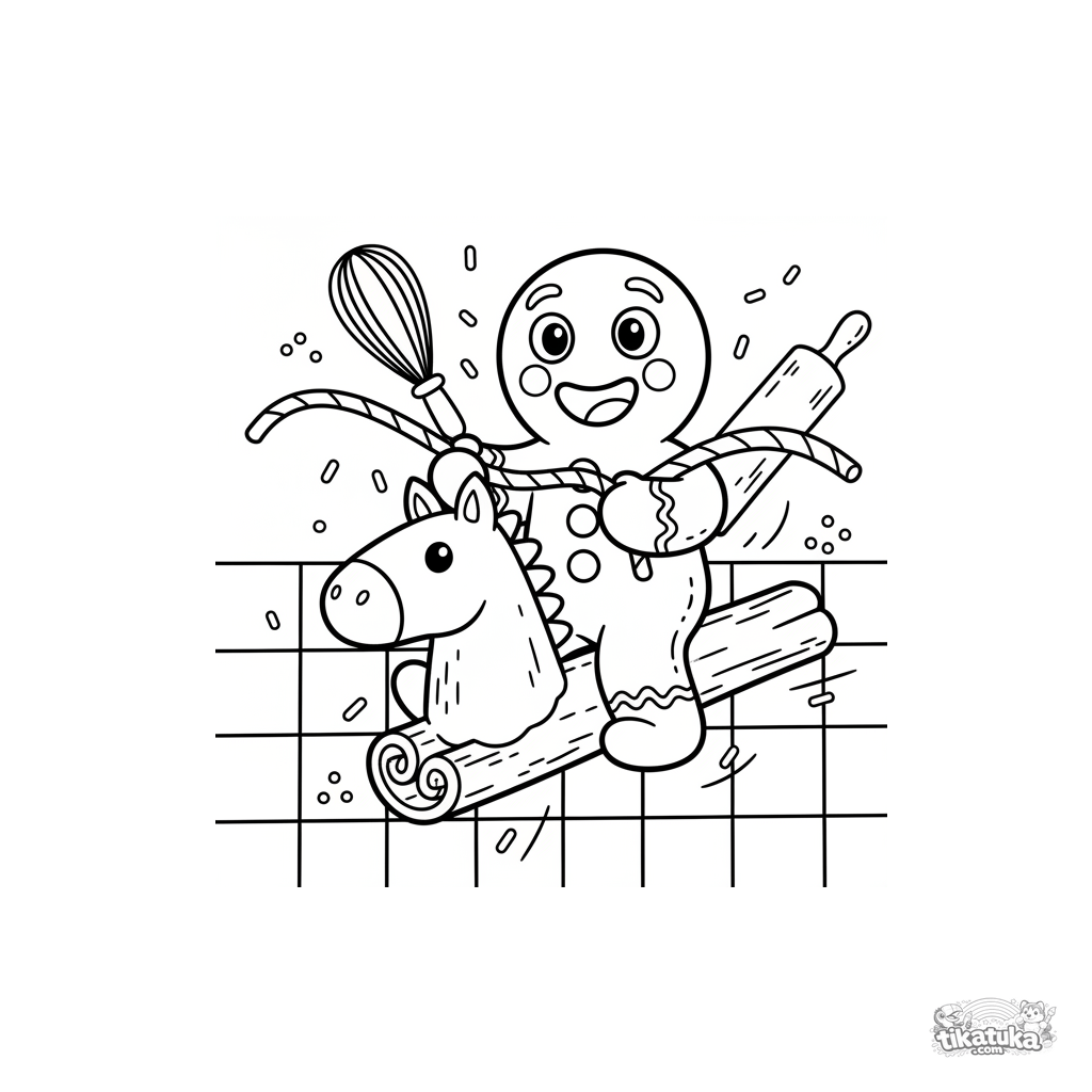 Página para colorir para crianças de 4-6 anos: um biscoito de gengibre alegre cavalga um cavalo de canela em pau sobre um pano de cozinha. Cena culinária de conto de fadas.