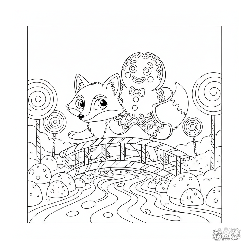 Página para colorir do conto do Biscoito de Gengibre. Para crianças de 6 a 9 anos. O biscoito de gengibre monta uma raposa sobre uma ponte de balas.