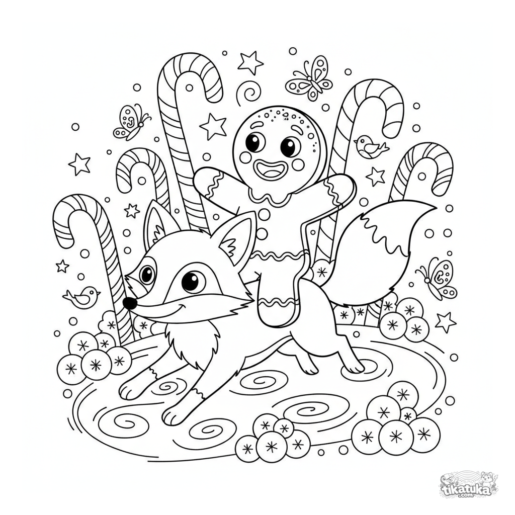 Página para colorir de um conto: um biscoito de gengibre monta uma raposa por uma floresta de bastões de doce. Cena doce e mágica para crianças de 6-9 anos.