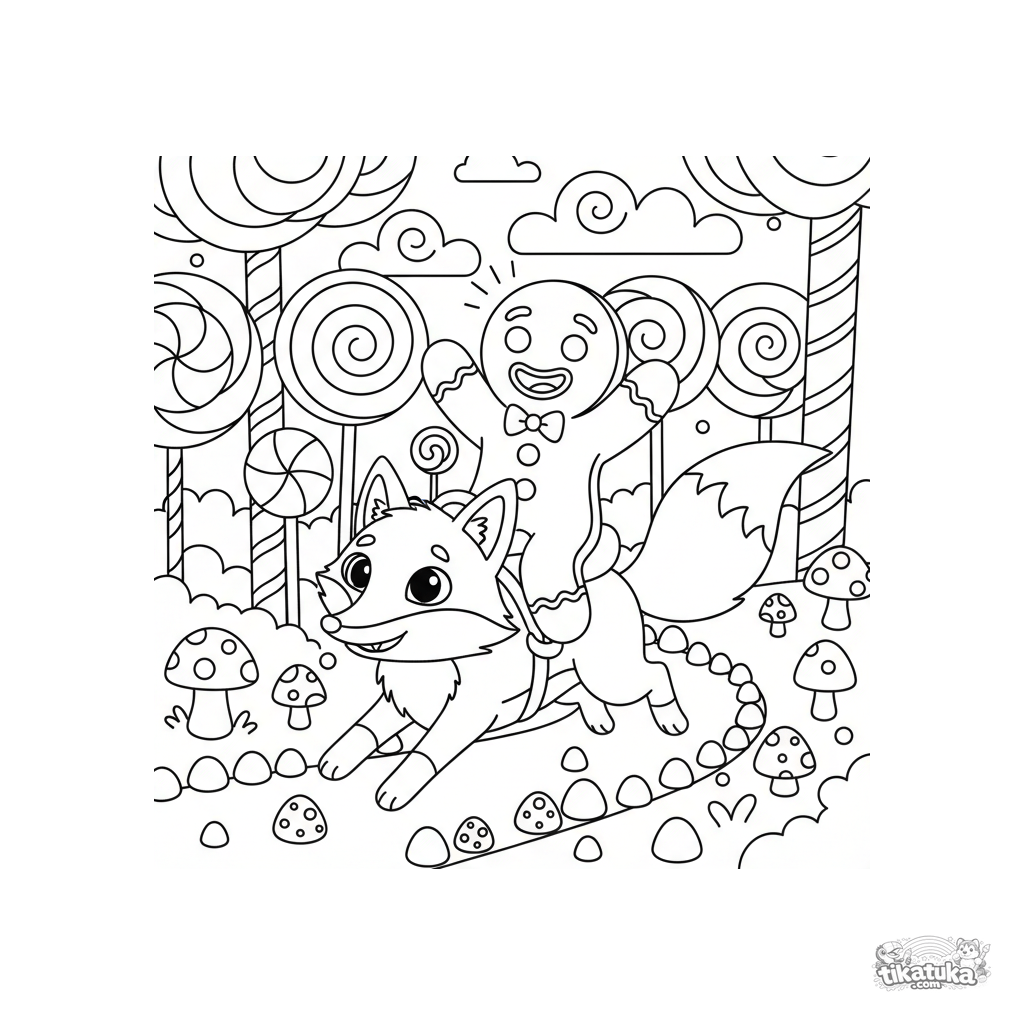 Página para colorir de conto de fadas: um alegre Biscoito de Gengibre monta uma raposa por uma floresta de bastões de doces e árvores de pirulito. Para crianças de 5 a 8 anos. Cena com detalhes de doces.