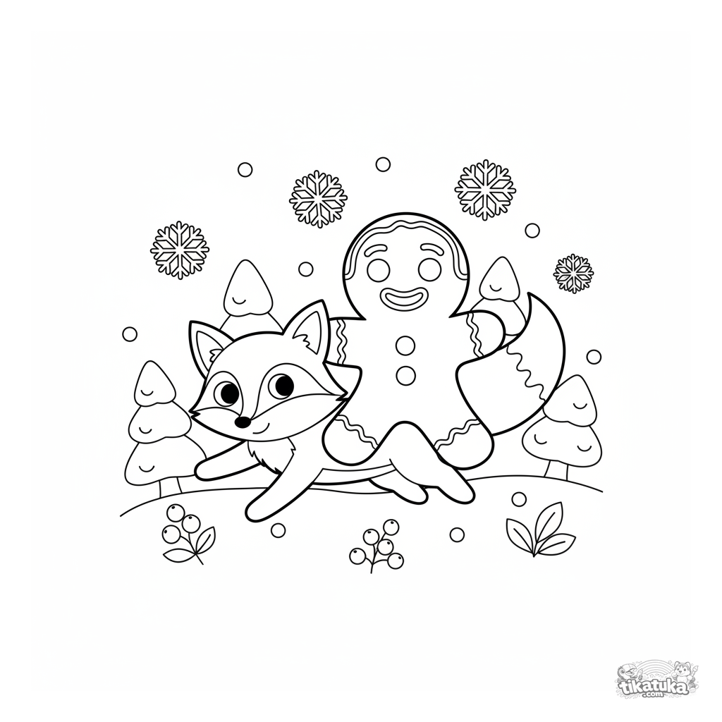 Página para colorir simples para crianças pequenas de 2-3 anos: um biscoito de gengibre monta uma raposa por uma floresta de inverno. Formas grandes e simples, perfeitas para começar a colorir.