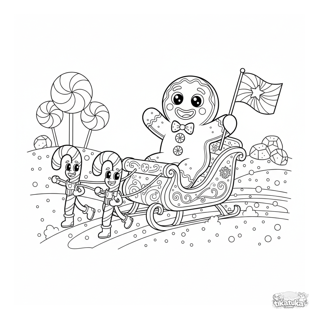 Página para colorir de conto de fadas de um biscoito de gengibre em um trenó de glacê puxado por bastões de doce. Para crianças de 5 a 8 anos.