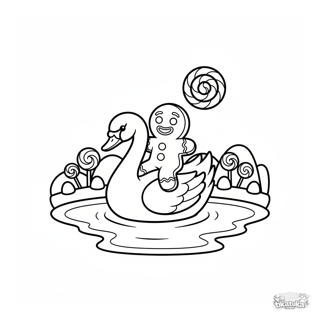 Página de conto de fadas para colorir: um alegre biscoito de gengibre monta um cisne de glacê por um lago de leite na Terra Doce. Para crianças pequenas de 2 a 5 anos.