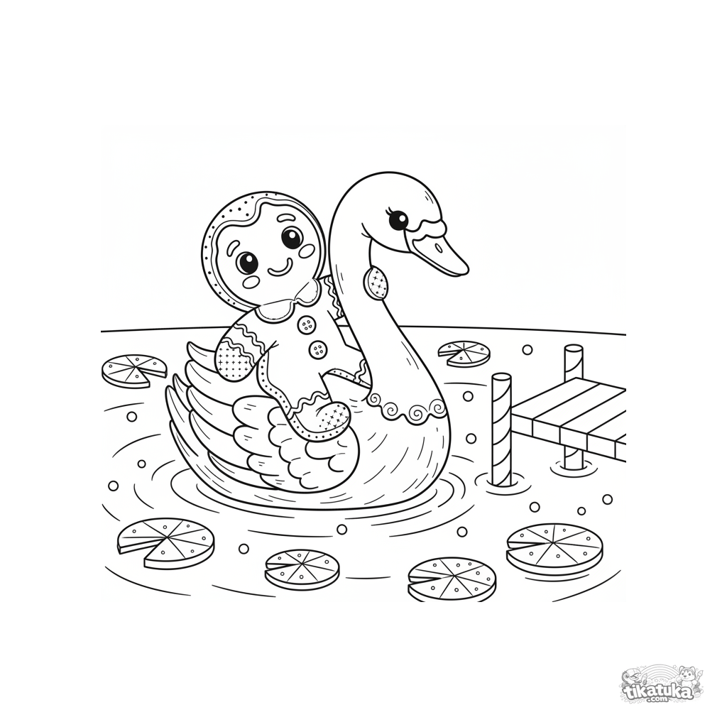 Página para colorir de conto de fadas: um biscoito de gengibre montado em um cisne de glacê em um lago leitoso. Para crianças de 6 a 9 anos. Cena doce e mágica.