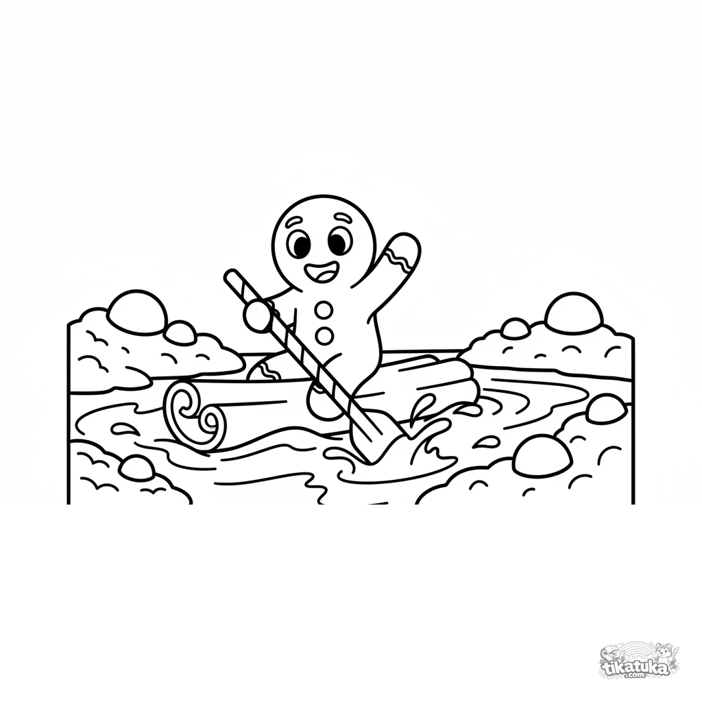 Página para colorir simples para crianças pequenas: um homem de gengibre feliz em um barco de canela em um rio de leite. Para 2-3 anos, formas grandes.