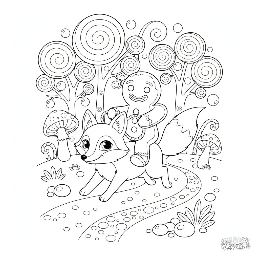 Página para colorir de conto de fadas: um biscoito de gengibre monta uma raposa através de uma floresta de doces mágica. Para crianças de 5 a 8 anos.