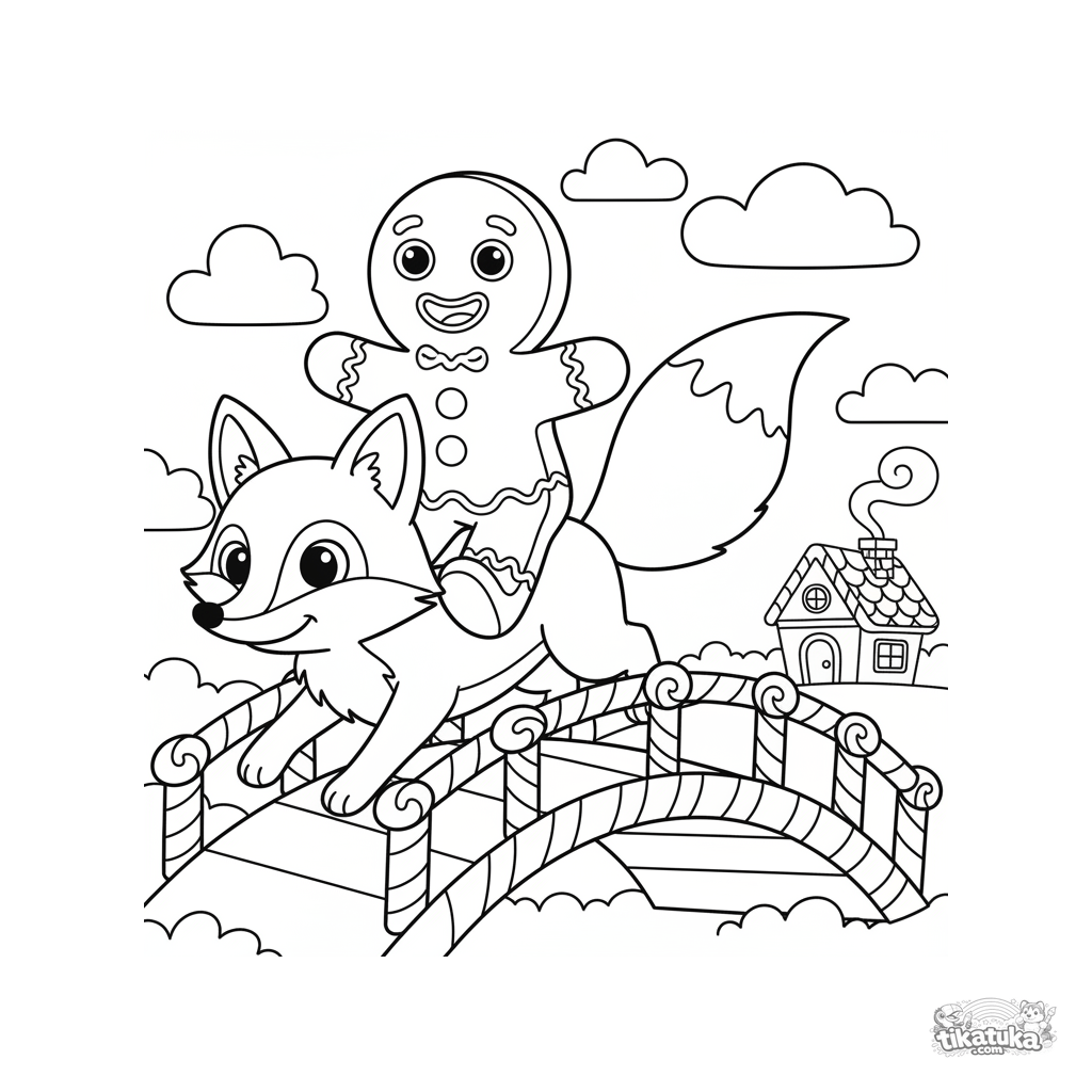 Página simples para colorir de conto de fadas: um biscoito de gengibre monta uma raposa por uma ponte de doces. Para crianças de 2 a 5 anos.