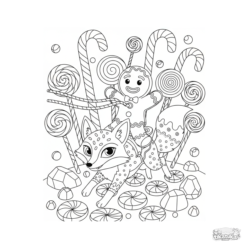 Página para colorir de conto de fadas: um biscoito de gengibre monta uma raposa por uma floresta de doces. Para crianças de 6 a 9 anos. Cena mágica com bastões de açúcar.