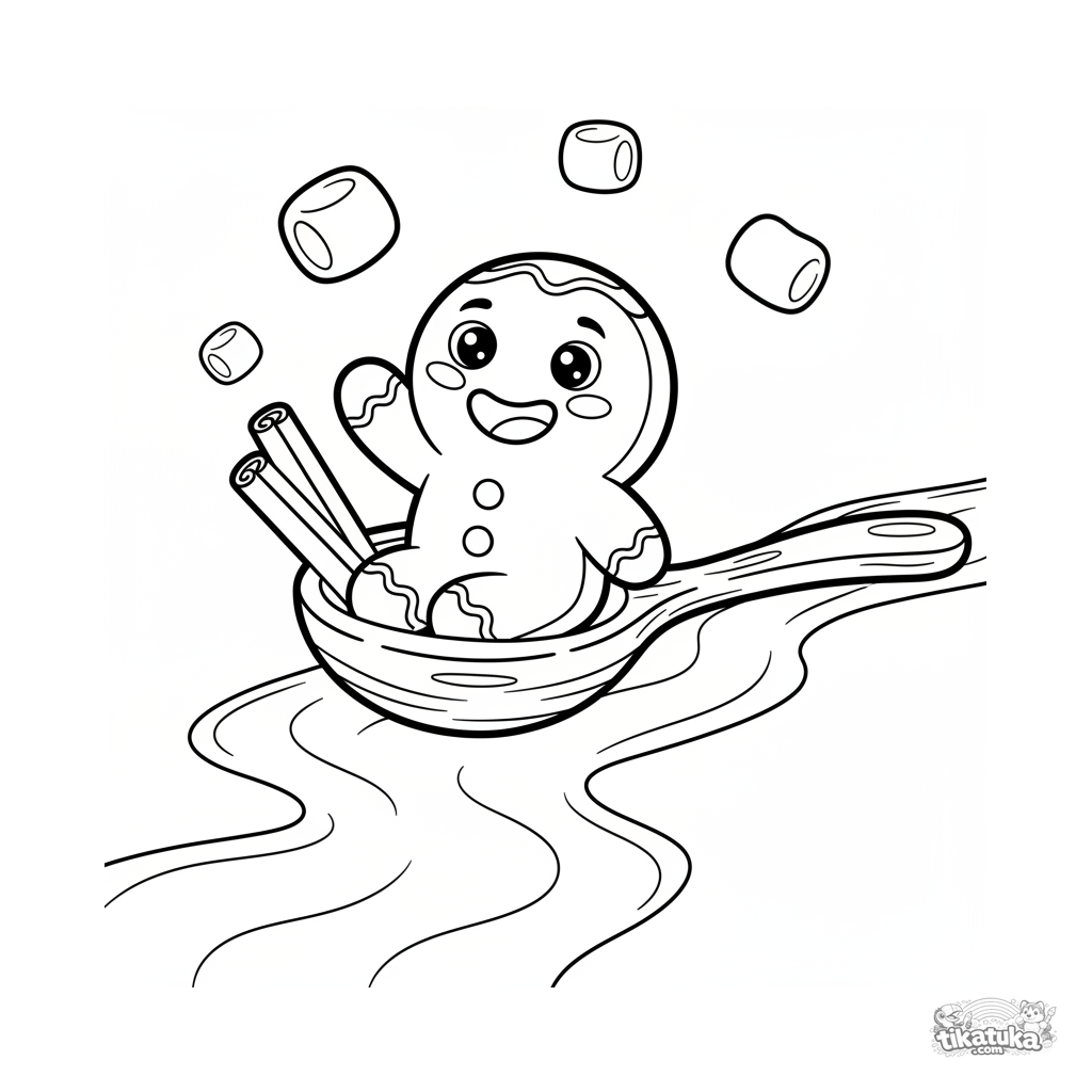 Página para colorir de um biscoito de gengibre feliz navegando em um barco-colher por um rio de leite. Para crianças de 2-5 anos. Cena de conto de fadas com doces e marshmallows.