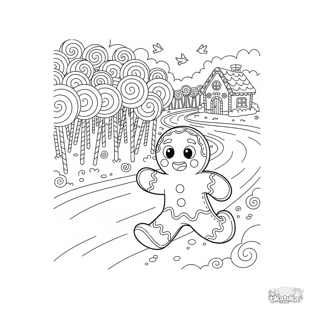 Página para colorir de conto: O Biscoito de Gengibre corre alarmado em direção a um rio de leite, com uma floresta de doces ao fundo. Cena detalhada para 7-12 anos.