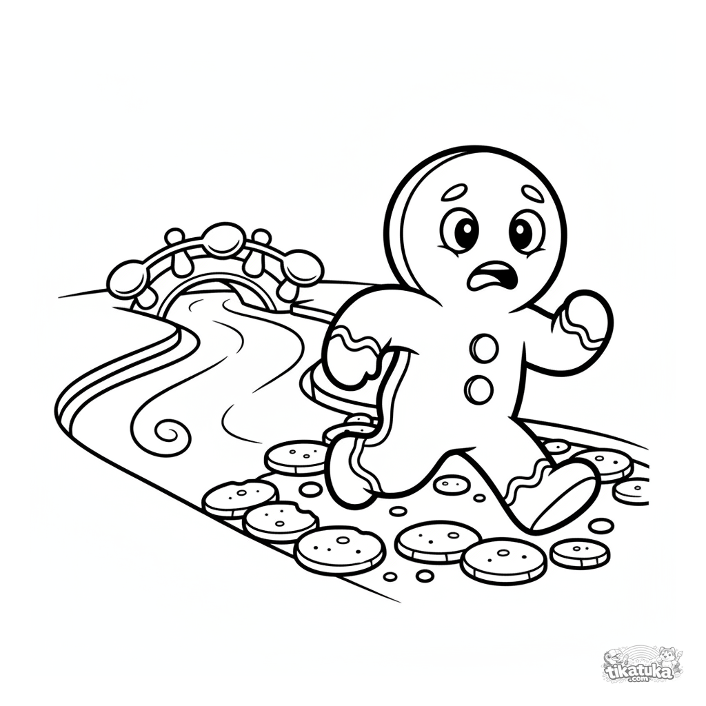 Página para colorir para crianças de 2-3 anos: O Homem de Gengibre fugindo de um rio de leite. Formas muito simples e grandes, perfeitas para primeiras experiências de colorir.