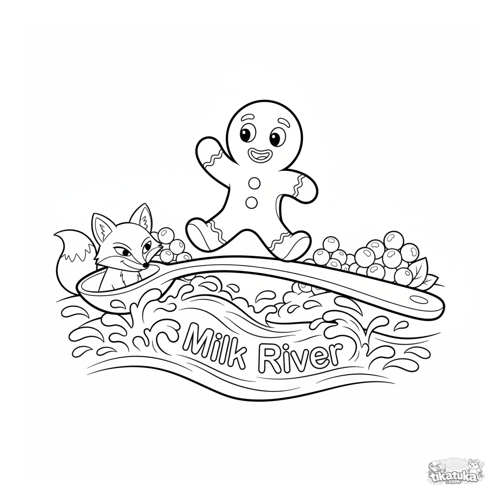 Página para colorir do conto do Biscoito de Gengibre, atravessando uma ponte-colher sobre o Rio de Leite. Para crianças de 4 a 6 anos.