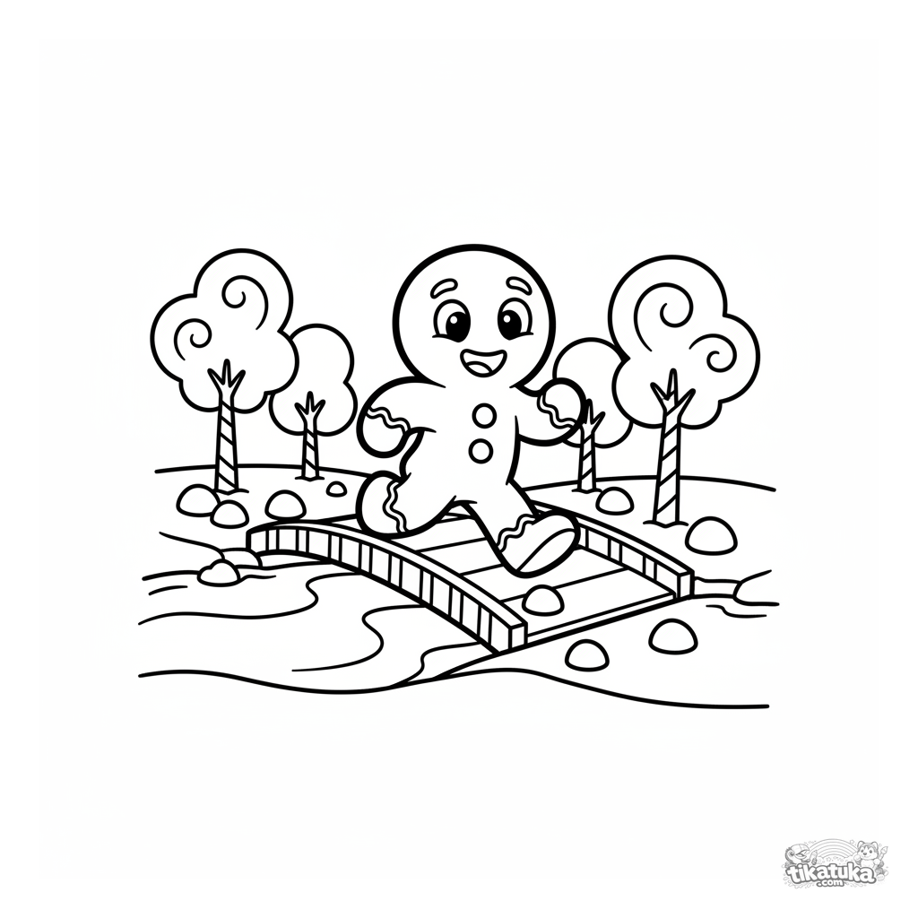 Página simples para colorir para bebês de 2-3 anos: O Biscoito de Gengibre corre alegremente por uma ponte de biscoito fugindo de um rio de leite. Formas grandes e claras.