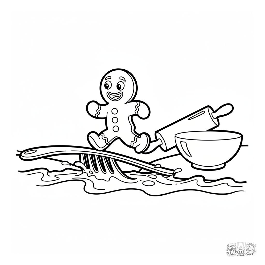 Página simples para colorir para crianças pequenas 2-3: O Biscoito de Gengibre corre por uma ponte de garfo. Formas grandes e claras, perfeitas para primeiros lápis.