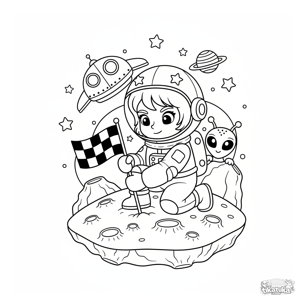 Página para colorir de uma menina astronauta plantando uma bandeira em um asteroide. Para crianças de 5 a 8 anos.