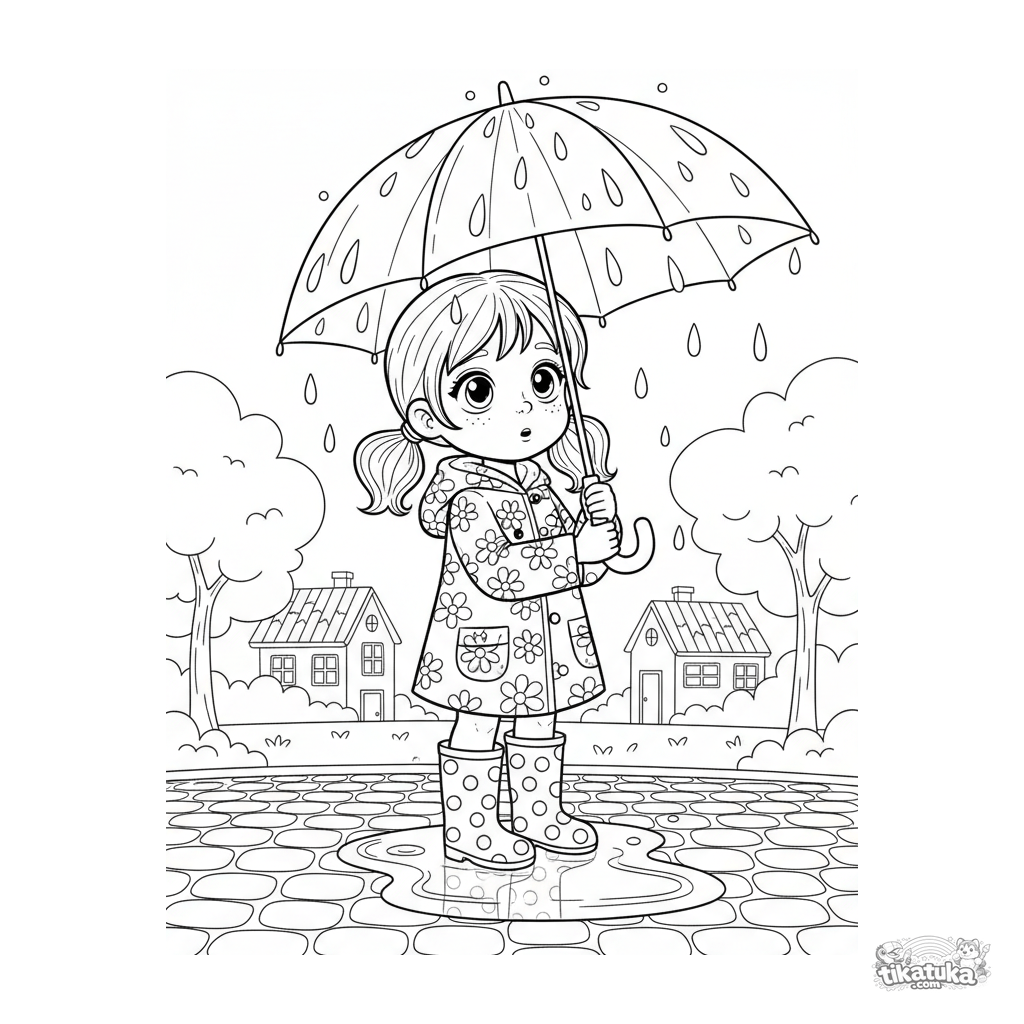 Página para colorir para crianças de 4-6 anos: uma menina com botas de borracha e capa de chuva pega gotas de chuva com seu guarda-chuva em uma rua de outono.