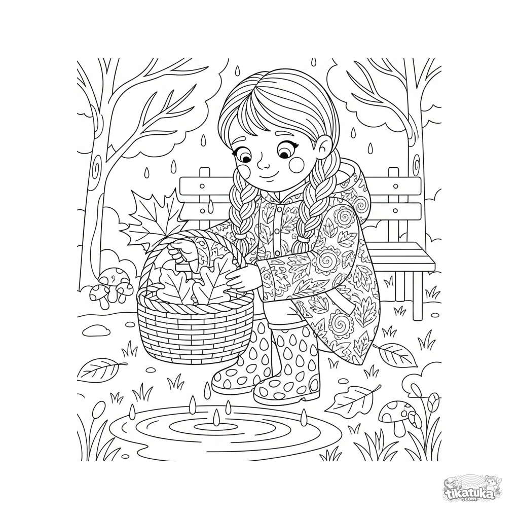 Página para colorir para crianças de 4-6 anos: uma menina de botas e capa de chuva coleta folhas coloridas de outono em uma cesta em um parque chuvoso. Formas claras, detalhes equilibrados.
