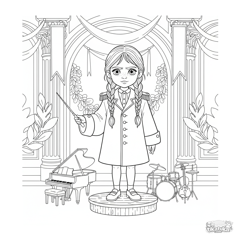 Página para colorir para 4-6 anos: uma menina regendo uma orquestra de brinquedos em um salão festivo. Formas claras, detalhe moderado, figura completa.